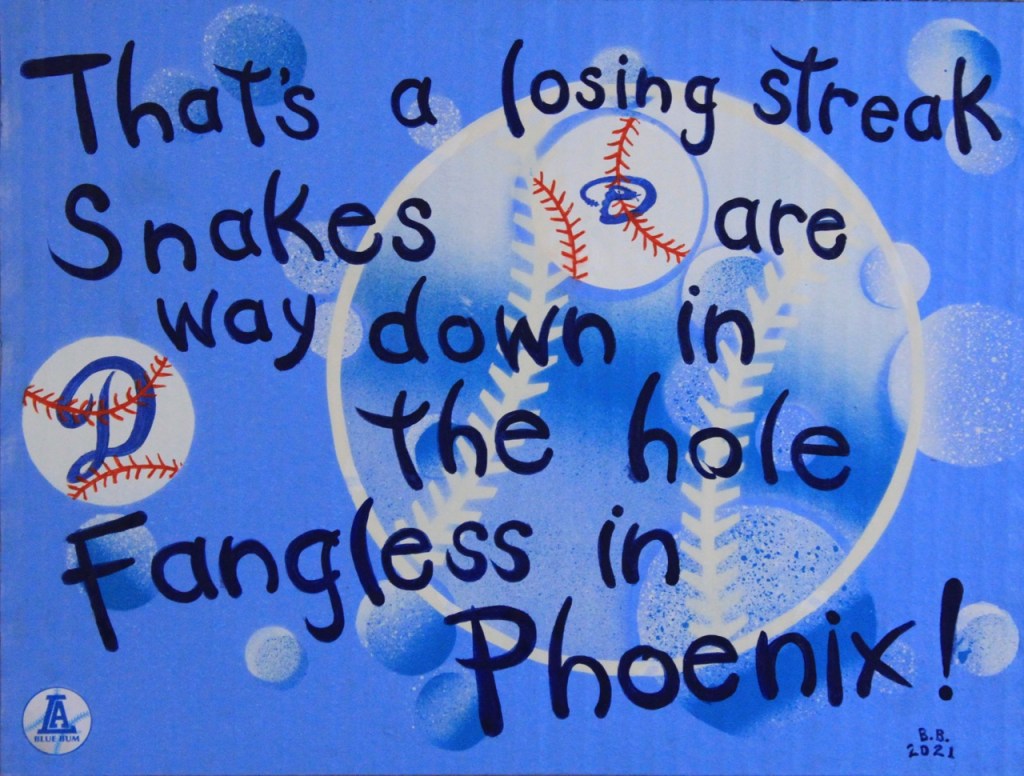 Fangless in Phoenix! Posted on June 20, 2021 by L.A. Blue Bum That’s a losing streakSnakes are way down in the holeFangless in Phoenix! Dodgers @ DiamondbacksJune 18-20, 2021
