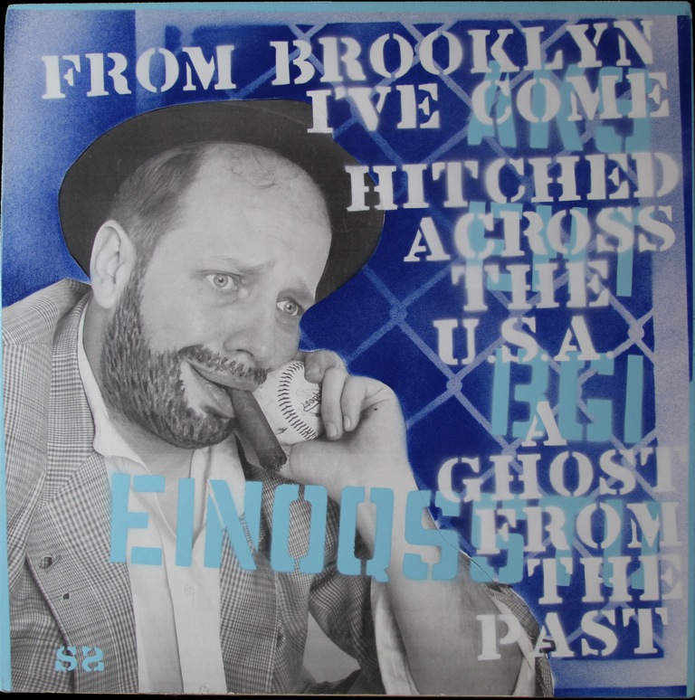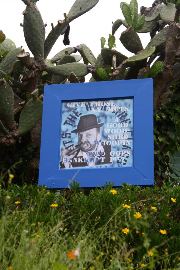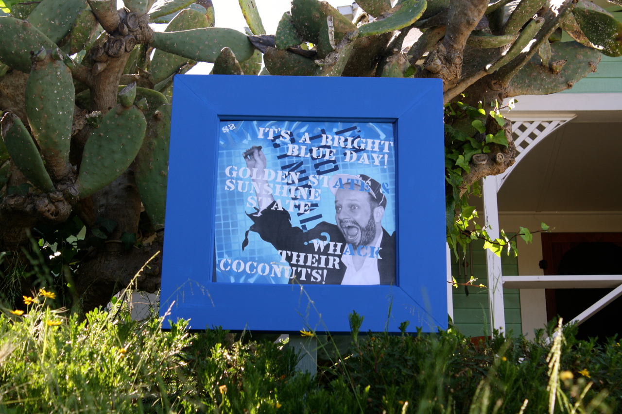 My current series of paintings, the L.A. Blue Bum series, evolved out of an ongoing project I started in 2007 in which I write haikus with a baseball (specifically Dodger baseball) theme and make a painting out of them for display in my front yard in Echo Park. Whereas the earlier pieces featured witty observations on America’s pastime, the newer paintings are far more complex, with layers of meaning for the viewer to discover. To symbolize the historical significance of the Los Angeles Dodgers, who are struggling through difficult times right now because of the owners’ divorce and financial uncertainties, I have resurrected a character from the past, the Brooklyn Bum first illustrated by the great Willard Mullin. Just as Mullin’s Bum symbolized as well as satirized the boys from Brooklyn, my reincarnation of the character, the L.A. Blue Bum — as personified by actor Joe Walters — roots for the boys in the Ravine while at the same time commenting with sometimes scathing candor on their follies and triumphs. But just as baseball, as American as apple Pie, has an ugly underbelly of drug use and greed, underlying the L.A. Blue Bum paintings are observations on the darker aspects of contemporary American society. (All Blue Bum paintings are aerosol enamel and latex on masonite.)